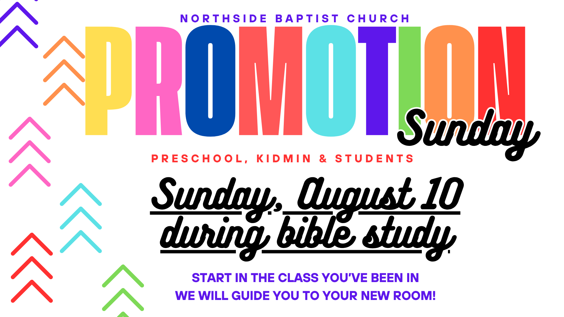 Promotion Sunday! Sunday, August 10, 2025 9:45 AM 10:45 AM 09:45 10:45 Northside Baptist Church 2800 North Beaton Street Corsicana, TX, 75110 United States (map) Google Calendar ICS It's Promotion Sunday! All kids and students will move up to their new classes based on the grade they're entering this school year. Join us as we celebrate growth and fresh starts together. Bible study starts at 9:45 AM—see you there!